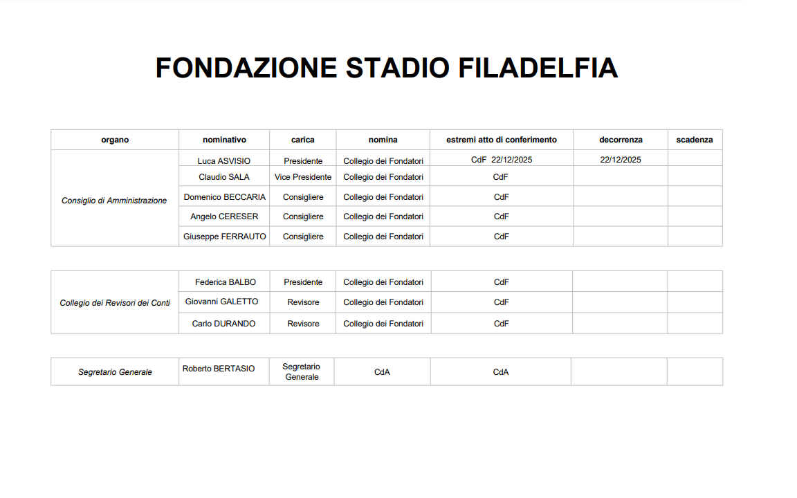 Fondatori PRESIDENTE Città di Torino Regione Piemonte Torino F.C. S.p.A. Circolo Soci Torino F.C. 1906 Associazione sportiva dilettantistica ex calciatori granata Onlus Comitato Dignità Granata Tifosi curva Maratona per lo stadio Filadelfia Tifosi della curva primavera per il campo Filadelfia Centro Coordinamento Toro Clubs Angeli del Filadelfia Associazione Memoria Storica Granata Consiglio di Amministrazione Presidente Vice Presidente Segretario Generale Luca ASVISIO Claudio SALA Roberto BERTASIO Consiglieri Domenico BECCARIA Angelo CERESER Giuseppe FERRAUTO Organi della Fondazione (ai sensi del Dlgs 33/2013) ORGANI DELLA FONDAZIONE - NOMINA DEL 22.12.2025 Revisori dei Conti Federica Balbo - Presidente Giovanni Galetto - Revisore effetivo Carlo Durando - Revisore effettivo
